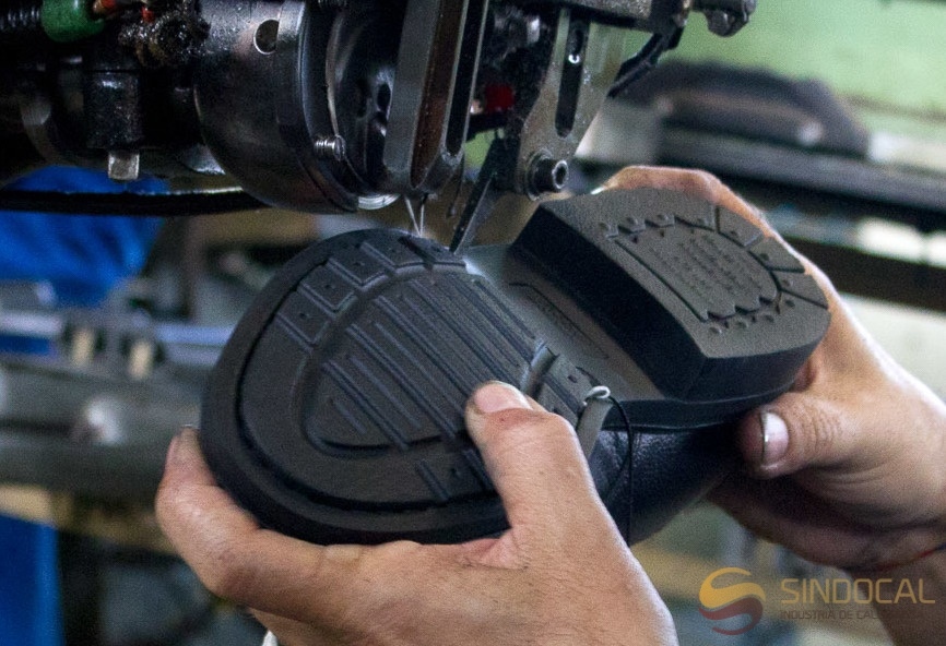 com a particularidade de levar uma costura que liga a sola à